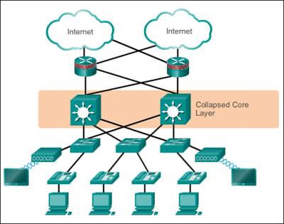 The two-tier “collapses” the core and distribution layers into one for smaller networks.